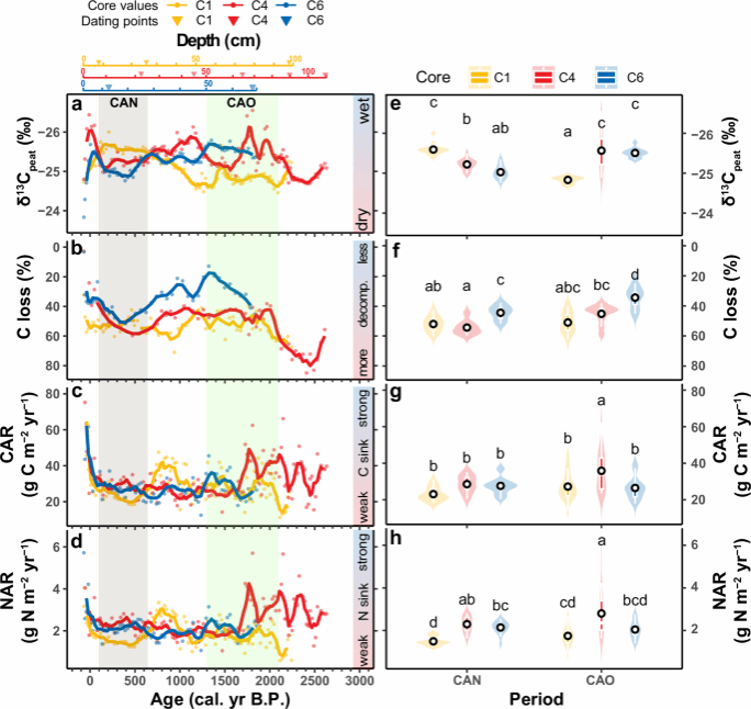 本研究以三江源地区长江南源的查旦泥炭地为研究对象(图1),通过多指标分析(包括碳氮含量、稳定同位素及红外光谱等)重建了该地区近2700年来泥炭碳氮累积与分解的动态过程。同时,通过整合北方泥炭地钻芯记录数据,系统评估了青藏高原泥炭地在全球陆地生态系统碳氮循环中的贡献。研究结果表明:近千年来,气候暖干化导致查旦泥炭地水位下降和地表干旱化(图2)。水位加深延长了泥炭在表层富氧层的滞留时间,促进了有机质分解,致使该时期碳氮累积速率显著降低(分别下降约20 kg C m-2 yr-1和2 kg N-2 yr-1)(图3)。这一现象可能在三江源地区具有普遍性。尽管如此,青藏高原仍是北方泥炭地中碳氮密度最高的地区之一(1米深度碳氮密度分别为54.1±18.9 kg C m-2和3.2±1.5 kg N m-2)(图4)。本研究强调了若未来气候持续暖干化可能会威胁青藏高原泥炭地碳氮库及碳氮汇能力的稳定性。