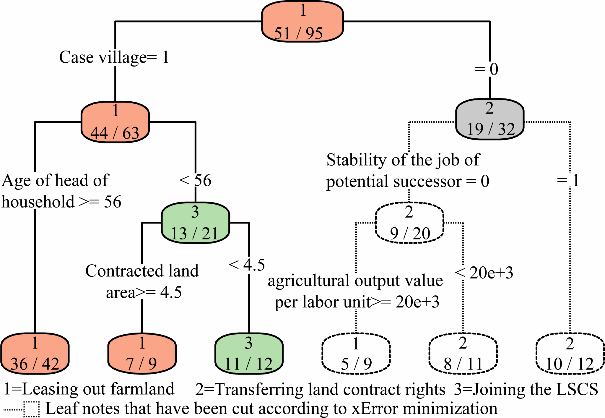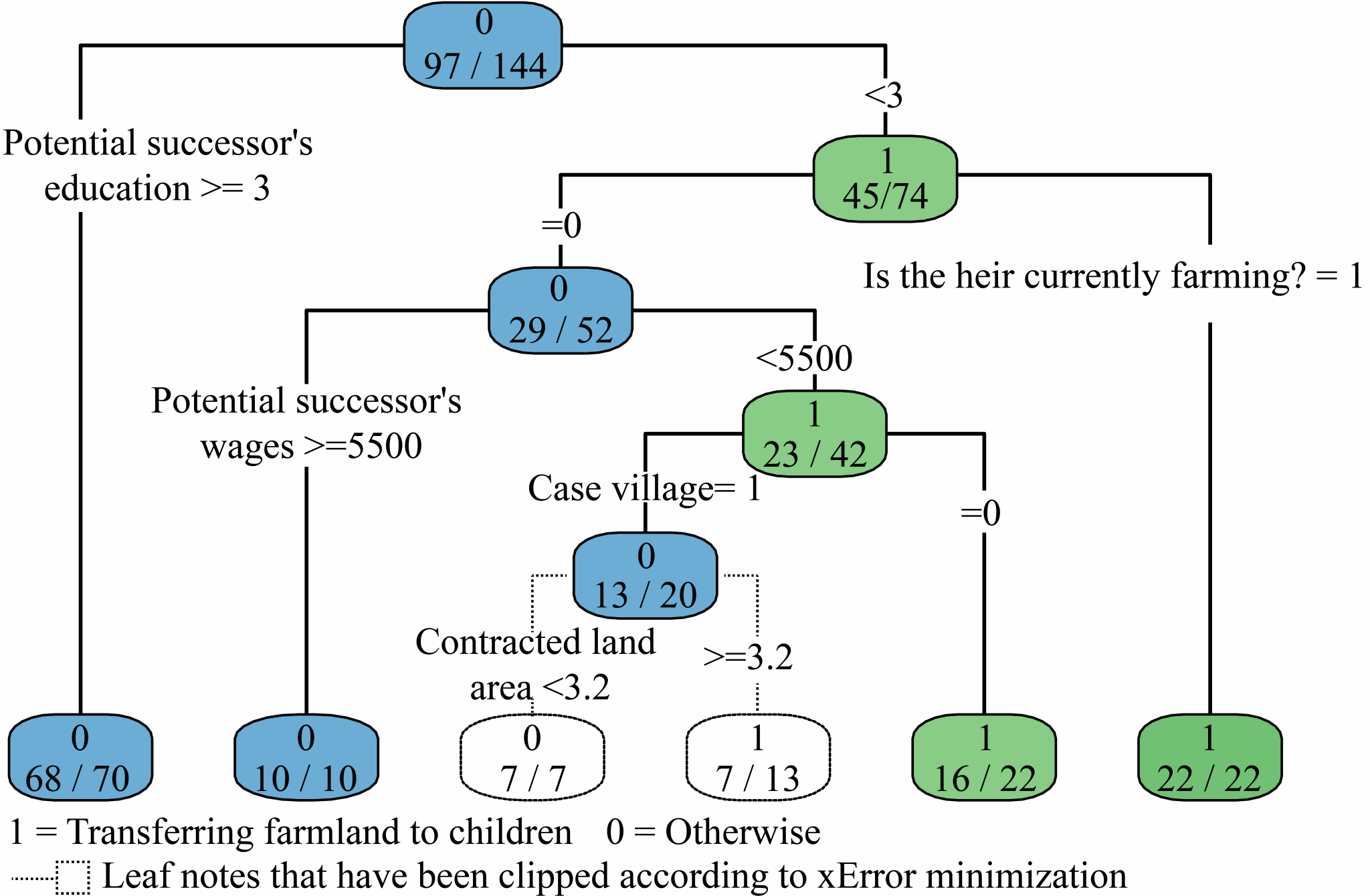 解析老年农户的农业实践特征和农户退休后的农地转移计划及影响因素与机制,是探讨老龄化对农业生产影响、把握农业未来演变和制订相关政策的重要内容。论文基于宏观结构背景、中观区域因素和微观个体特征的嵌套结构,构建了农地转移计划的解释框架(图1),通过对辽宁省盖州市两个果蔬种植专业村的田野调查,采用机器学习模型等方法进行实证研究(图2)。结果显示,案例地农业人口老龄化问题严重,给劳动密集型农业生产带来诸多难题,老年农户采取了一些适应性策略以维持生产。研究发现,农地转移计划受多尺度因素影响。宏观上,农业与非农部门的收入差距和城乡差距导致年轻一代在主观意愿上普遍排斥接管农地,农地代际转移存在困难。中观上,村庄区位和地方化农业实践影响农地转移计划。微观上,潜在继任者的受教育程度、职业特征、非农工资水平、家庭承包地面积等影响代际转移计划(图3);而对于未选择代际转移的农户,其农地转移计划受户主年龄、承包地面积、潜在继承人非农工作稳定性、劳均农业产值等因素影响(图4)。最后,论文讨论了劳动密集型农业未来三条可能的发展路径:雇佣流动劳动力,推进机械化,转向低劳动密集型农业。