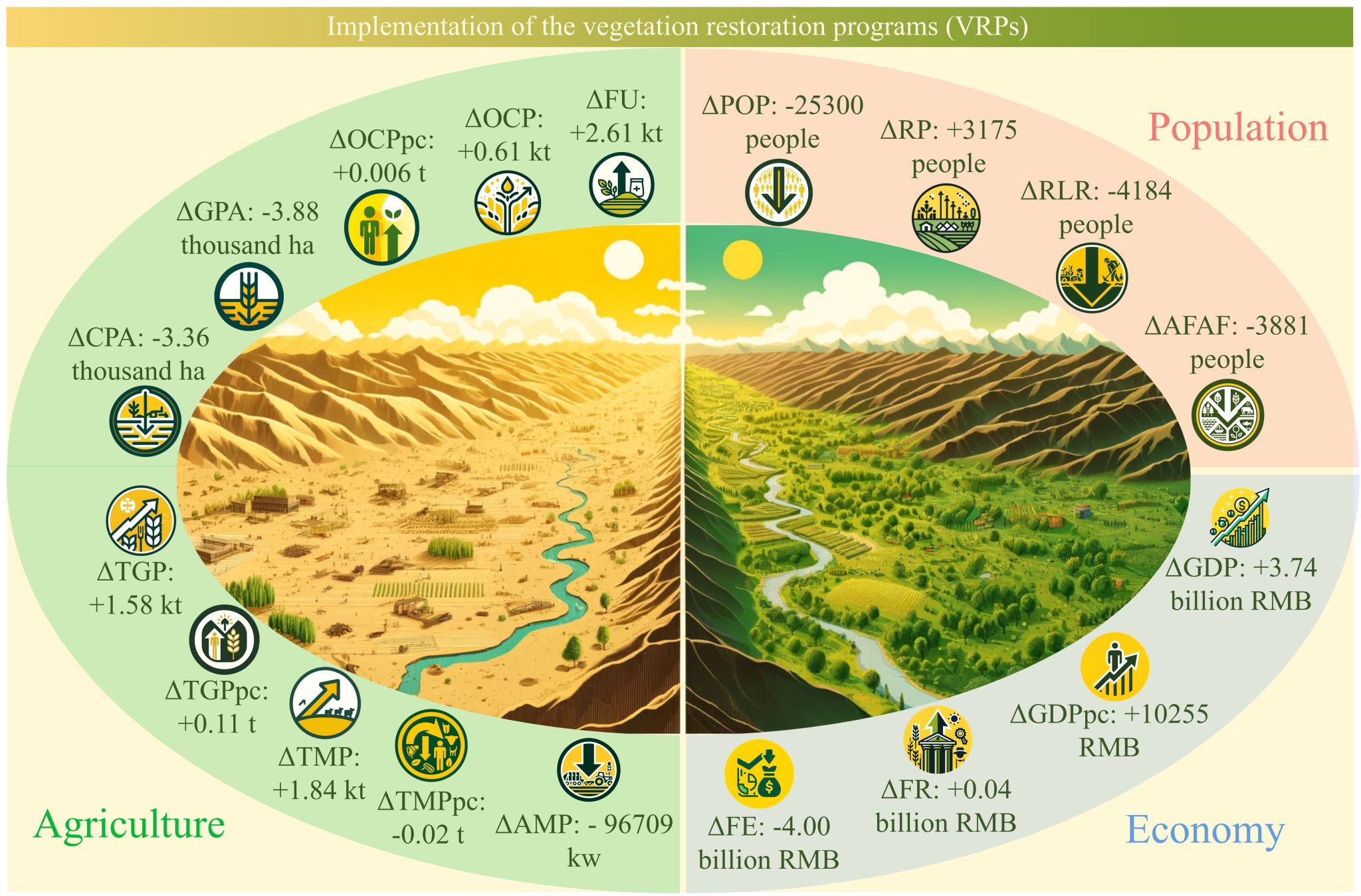 在黄土高原地区,政府实施了多项植被恢复工程(VRPs),显著提升了植被覆盖率,有效遏制了水土流失,在生态环境方面取得了显著成效。作为一项综合性的社会—生态系统干预措施,VRPs对当地社会经济系统的影响,包括农业生产方式的转变、人口分布的变化以及区域经济发展格局的调整等,尚缺乏系统性的量化评估。因此,评估VRPs的在社会经济等方面的影响,对于优化和完善生态恢复政策具有重要意义。