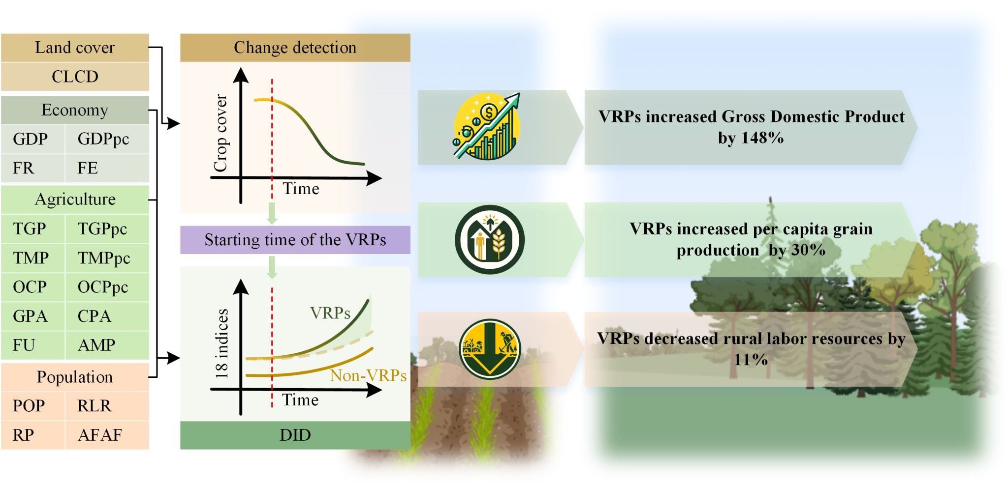 本研究基于1980年以来的县域尺度统计数据,结合从时间序列土地利用数据中提取的VRPs政策启动时间,采用双重差分法(DID),通过比较实施VRPs的区县(实验组)与未实施VRPs的区县(对照组)在政策实施前后的变化,以评估VRPs对经济、农业和人口方面各项指标的影响(图1)。