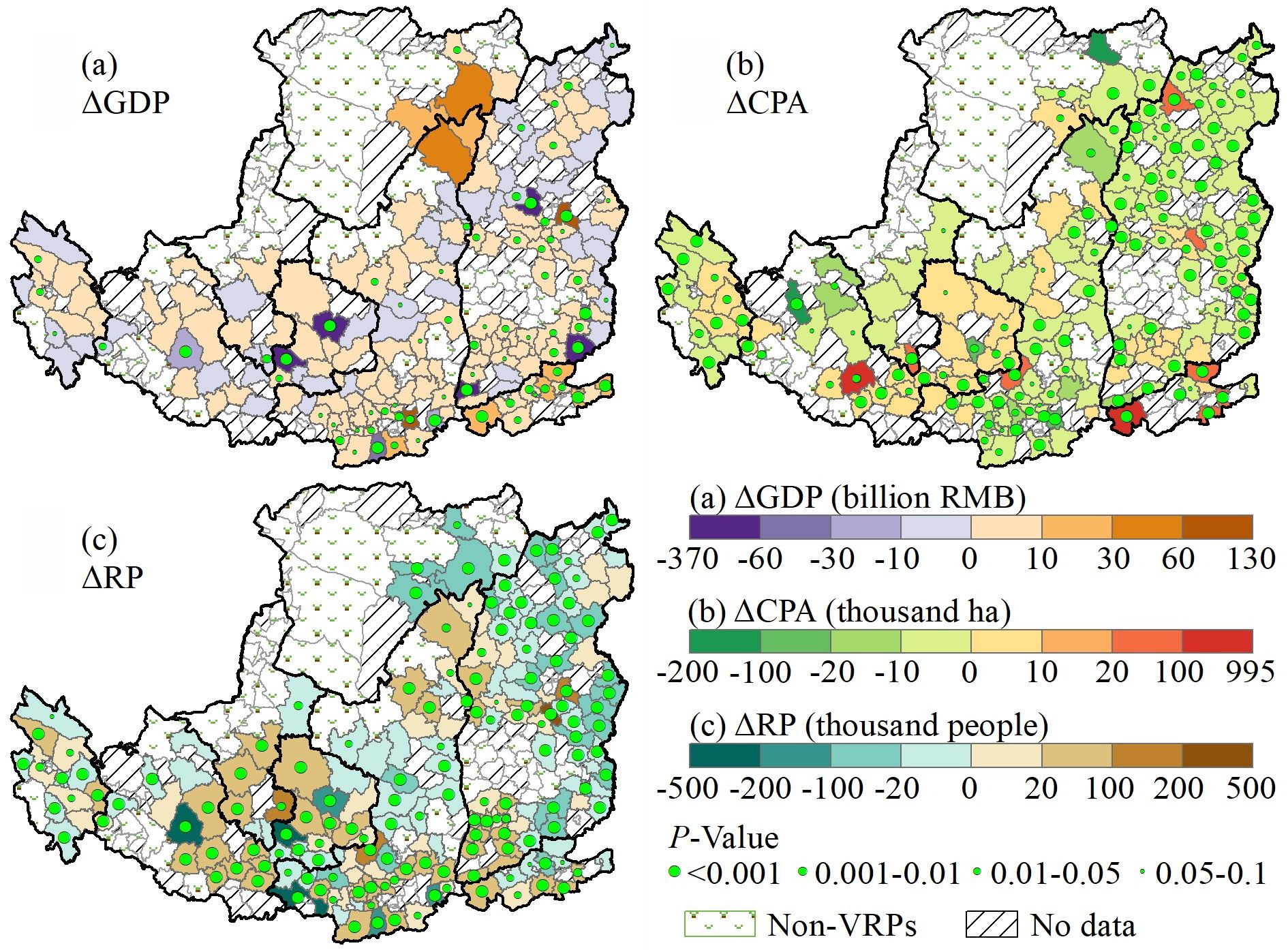 图3 VRPs对人口、农业和经济指标影响的空间变化。Δ代表VRPs导致的相关指标的变化。GDP:国内生产总值,CPA:农作物种植面积,RP:农村人口。点的大小表示显著性水平,没有点的区域P > 0.1。