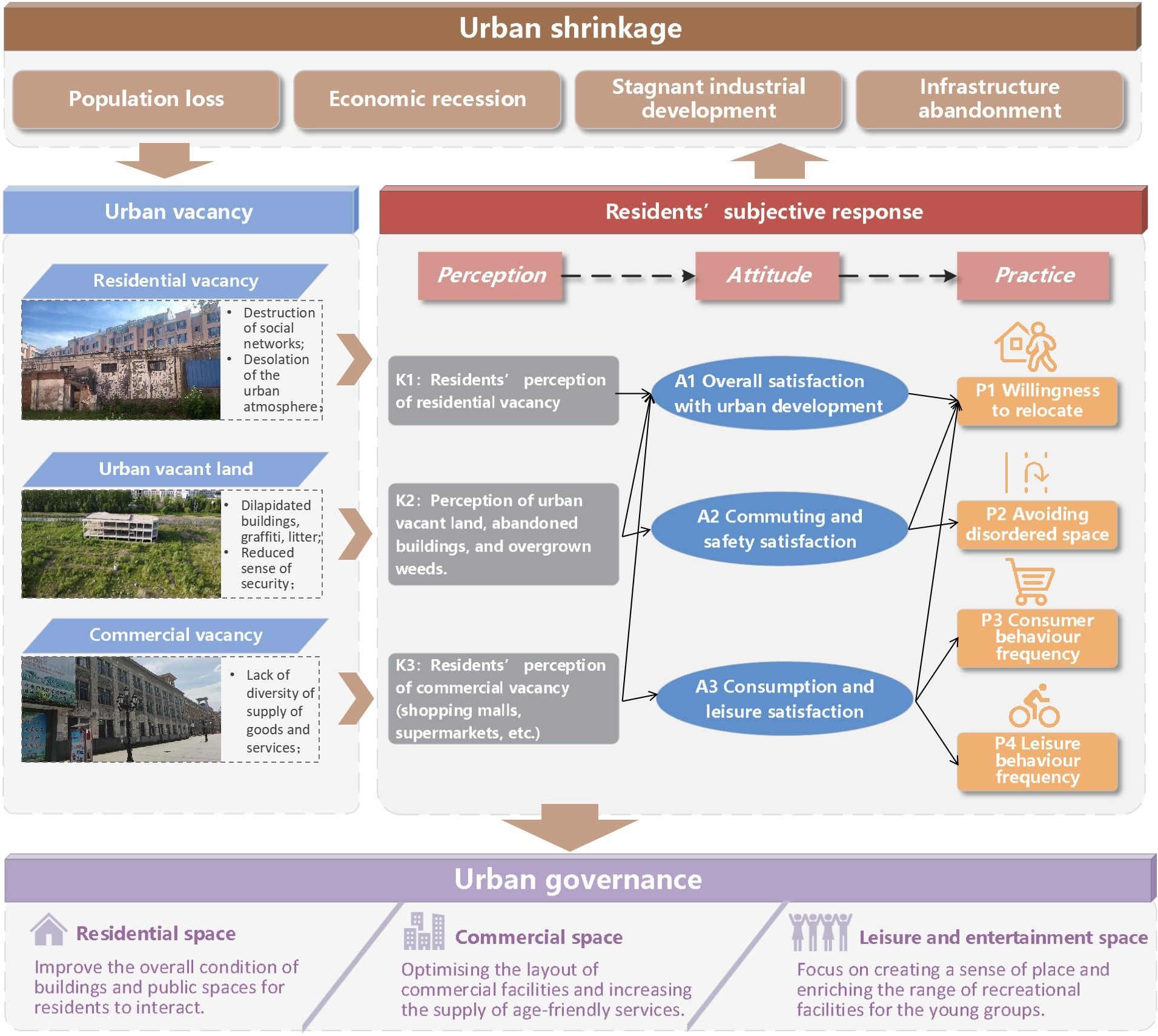 结果表明,整体上,居民对城市空置按照“感知—态度—行为”的路径进行传导和响应(图2),行为响应分为两种类型:一种是通过搬迁的方式“逃离”收缩城市的空置空间和荒凉的环境氛围;一种是降低城市内休闲、消费等活动的参与频率“回避”无序空间。居民对不同类型城市空置的感知将形成差异化的传导路径。对住宅空置的感知降低城市发展整体满意度,进而增强其迁居意图(图3);对空地的感知集中表现为对社区环境和随之滋生的卫生问题的担忧,而非犯罪恐惧(图4);对商业空置的感知不仅通过抑制消费与休闲满意度降低居民商业空间与休闲空间的到访频率,还通过消费与休闲满意度和城市发展整体满意度形成的链式中介作用于居民迁居行为(图5)。不同年龄、教育水平、收入水平、居住时长的受访者行为响应表现出路径差异性。研究结果为收缩城市空置如何影响居民感知与行为提供了理论解释,针对失序空间的清理、改造、空间再利用和合理布局商业设施将是提升居民满意度与城市活力的有效措施。