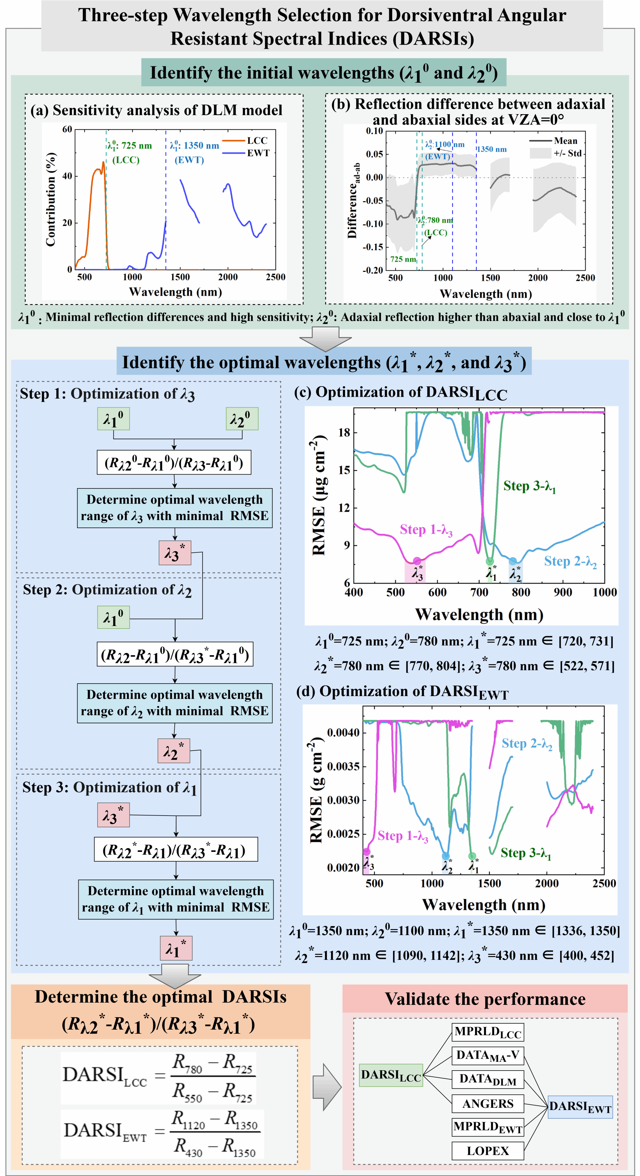 本研究提出了一种异面叶角度抗性光谱指数(Dorsiventral and Angular Resistant Spectral Indices, DARSIs),旨在去除异面叶多角度反射不对称效应对叶片生化性状估算的影响,同时保持对生化参数的高度敏感性。DARSIs的最优波段组合的确定参考了Gitelson等人提出的三步波段选择方法的部分理论,并基于叶片正反两面多角度反射光谱和物理模型的敏感性分析结果,对该方法进行了改进,使其适用于异面叶的特征波段选择。