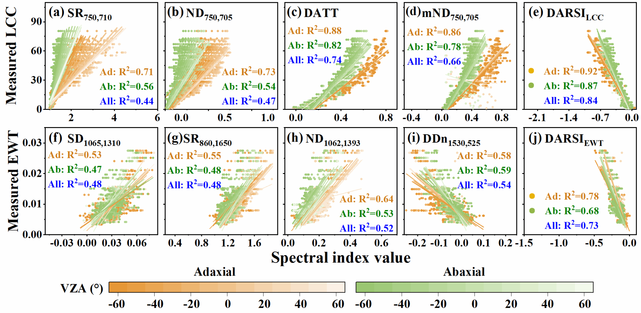 图3.不同观测天顶角以及叶面条件下光谱指数与实测生化参数的散点图 (a-e) 叶绿素含量;(f-j) 等效水厚度