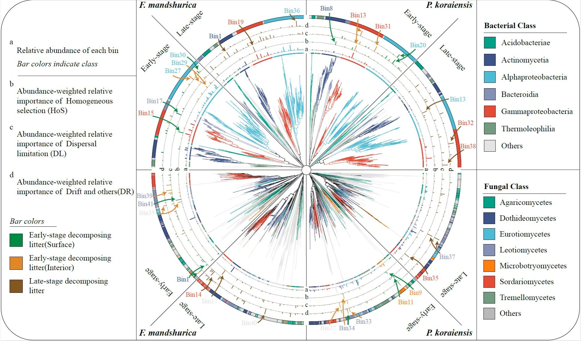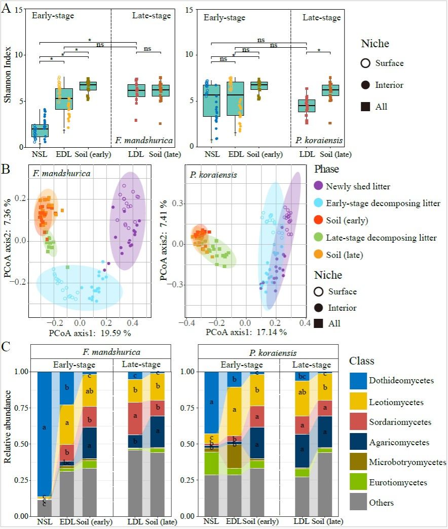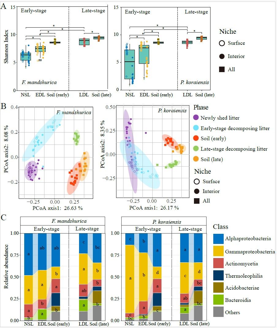 结果表明,在分解早期,红松凋落物主要由叶际细菌和真菌主导,而水曲柳的分解则主要受土壤真菌和叶际细菌的共同作用。随着分解进程推进,土壤来源的微生物逐渐取代叶际群落,成为晚期分解的主要驱动力。细菌群落主要受确定性过程(同质选择)调控,而真菌群落更受随机过程(扩散限制、漂变)影响。研究还揭示了不同质量凋落物在微生物演替上的差异。这些发现强调了微生物群落演替在驱动凋落物分解中的核心作用,为未来在森林生态系统管理中引入微生物演替机制、提升土壤健康与碳汇功能奠定了基础。
