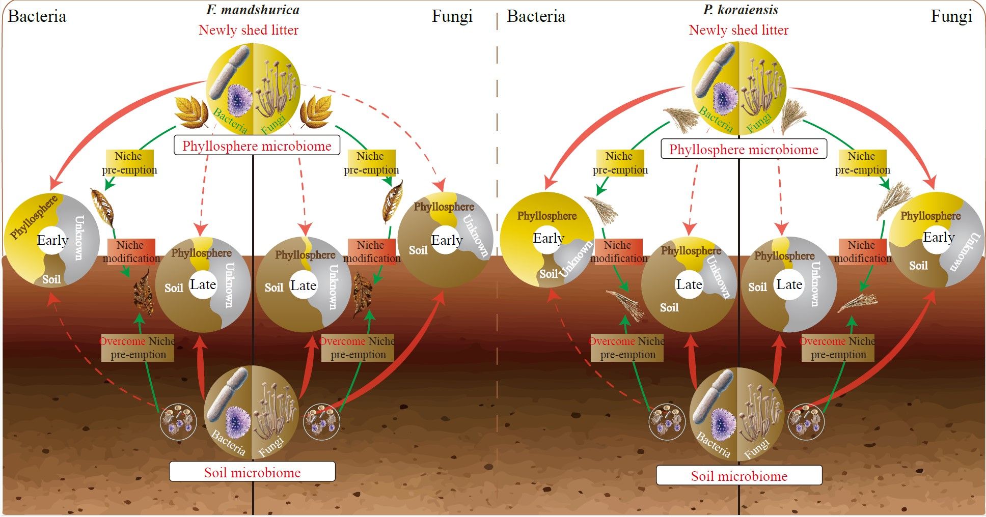 本研究以长白山的两种典型树种——水曲柳(Fraxinus mandshurica)和红松(Pinus koraiensis)为对象,结合不同分解阶段(新落叶、早期分解、晚期分解)和微生物来源(叶际和土壤),利用高通量测序与生态组装模型,系统分析了细菌与真菌群落的来源与演替及其在分解过程中的关键作用。