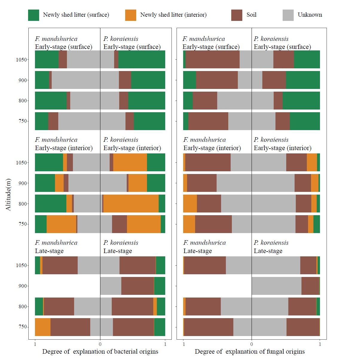 图1 水曲柳、红松凋落物中细菌(左)和真菌(右)的来源