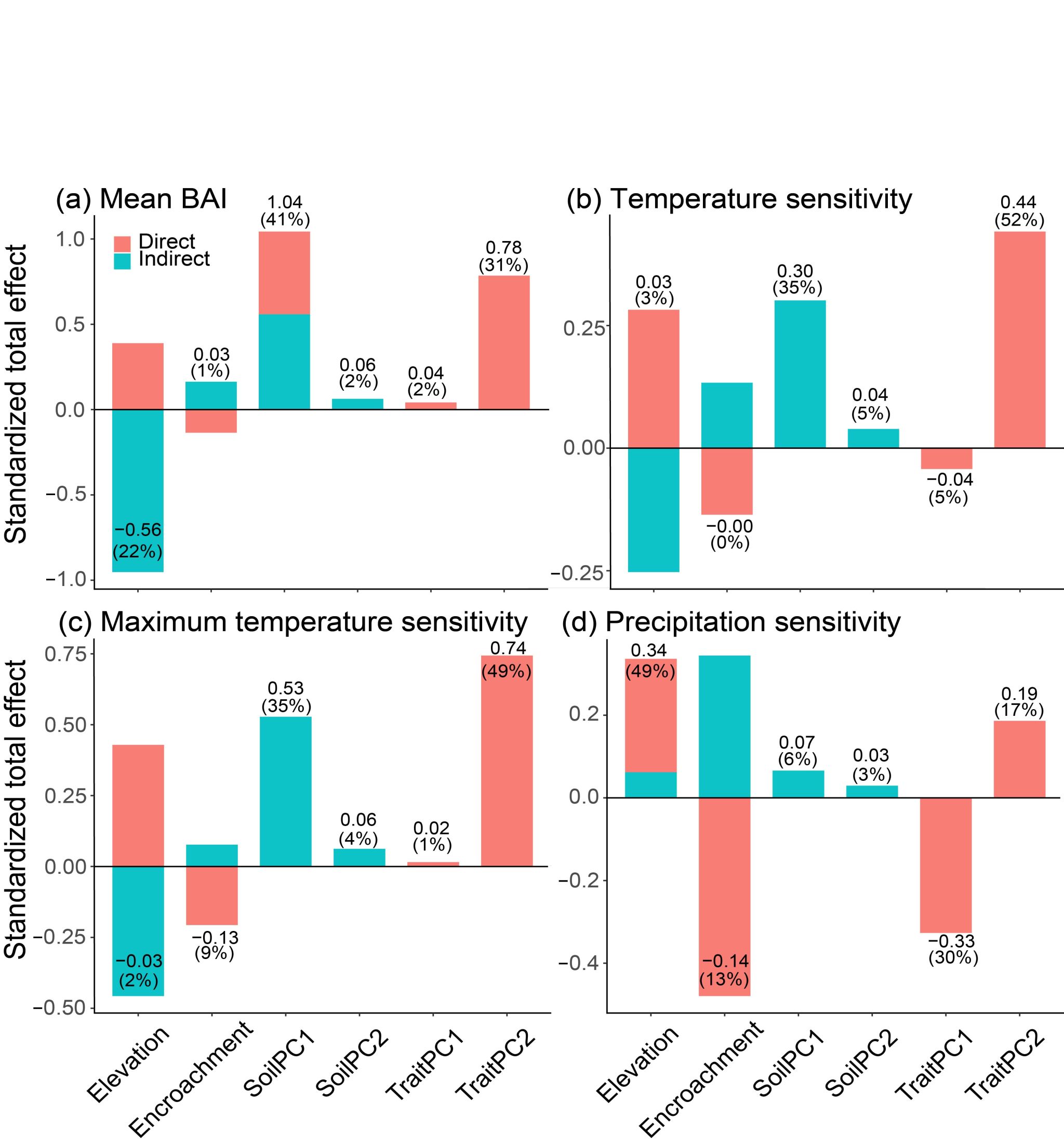 图4. 海拔、大叶章上侵、土壤特性及植物功能性状对平均BAI、温度敏感性、最高温度敏感性及降水敏感性的标准化总效应图