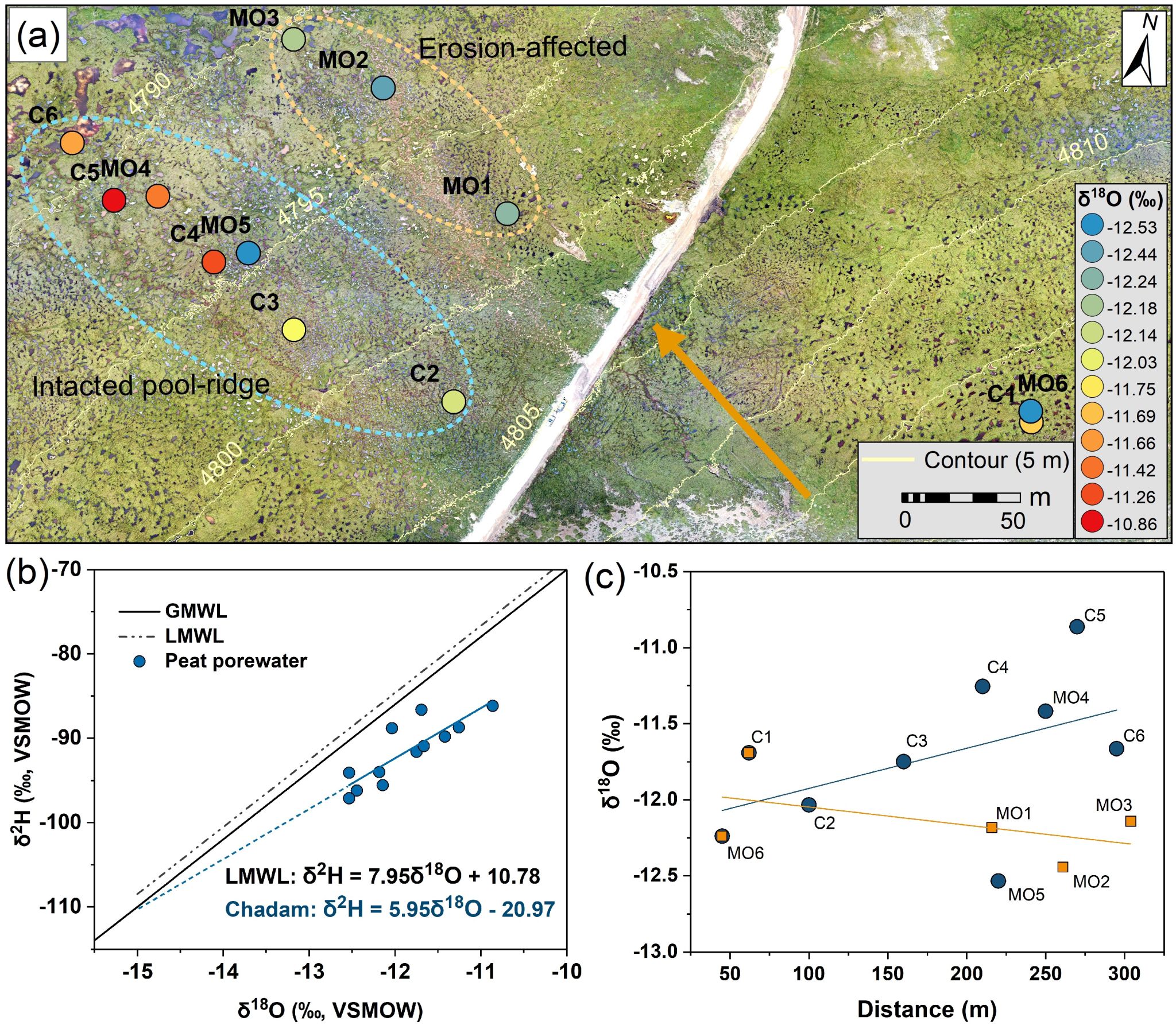 研究表明,查旦泥炭地以高山嵩草为主要建群种,其根系密集且深,形成的泥炭具有异常高的干容重(均值0.48 g cm-3) 和极低的水平水力传导率(表层Kh = 0.01 cm s⁻¹),显著区别于典型的北方泥炭地(图2)。模型模拟表明,在低净降水量(年均165 mm)和5°的坡地条件下,只有低Kh情景能够维持千年尺度的积水状态,支持泥炭持续积累至实测厚度;而高Kh情景则因排水过快,无法形成和维持高水位,导致模拟泥炭厚度显著低于实测值(图3)。孔隙水同位素数据进一步证实了该泥炭地浅层地下水流动缓慢且蒸发强烈的特征(图4),与模型结果高度一致。