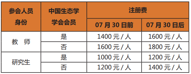 会议注册费见下表,请与会代表凭中国生态学会会员证和研究生学生证等证件领取会议材料和参会交流:
