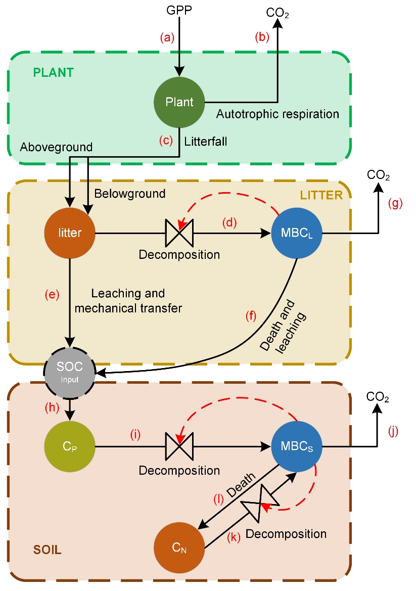 图4.凋落物分解和土壤有机质分解模型(Fan et al.,2023,GBC)