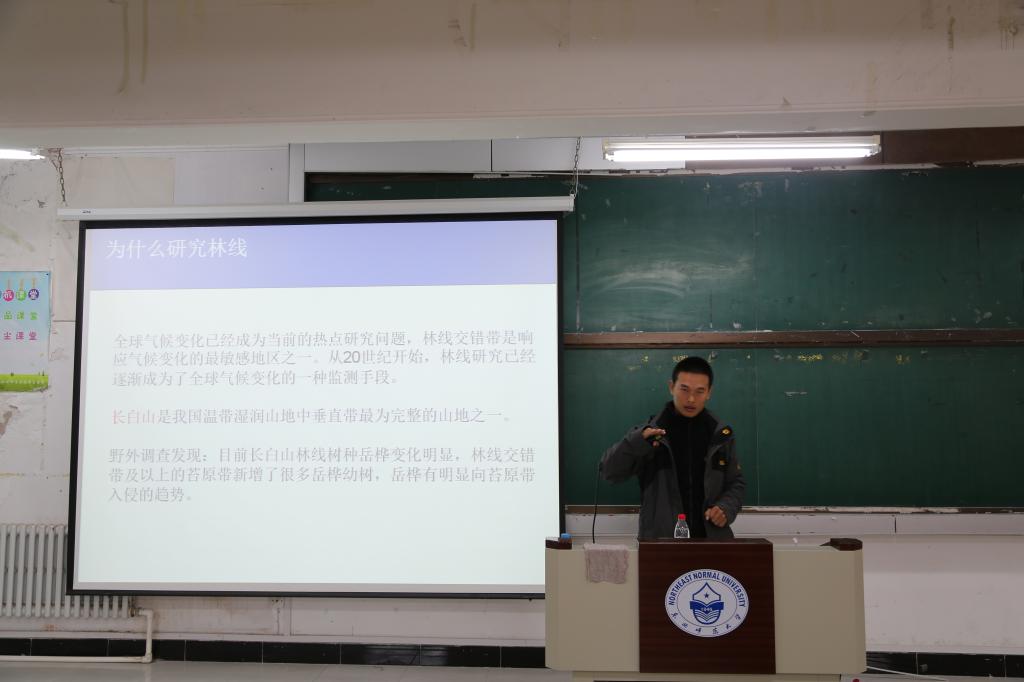 首先,孙仲秋老师以遥感与自然环境为主题,讲述了水面、植物冠层、积雪、土壤砂石的方向反射以及地表目标的真实反射。孙仲秋老师通过GIS在生活上的应用,图文并茂地展示了当前各种软件在地理信息可视化上的应用,将深奥的遥感理论与实际结合在一起,使得原本复杂的科研报告变得清晰易懂,赢得了同学们的阵阵掌声。接着杜海波老师就“长白山林线对气候变化影响机理研究”展开报告,介绍了为什么要研究林线、林线处环境因子对岳桦幼树生长的影响以及林线位置潜在高度的研究,讲述了由林线与环境的关系而引发的一系列科学研究的进展情况,并展示了一系列野外工作的照片。杜海波老师的讲解引起了同学们浓厚的兴趣。最后,老师与同学们在欢快的气氛中结束了整场讲座。