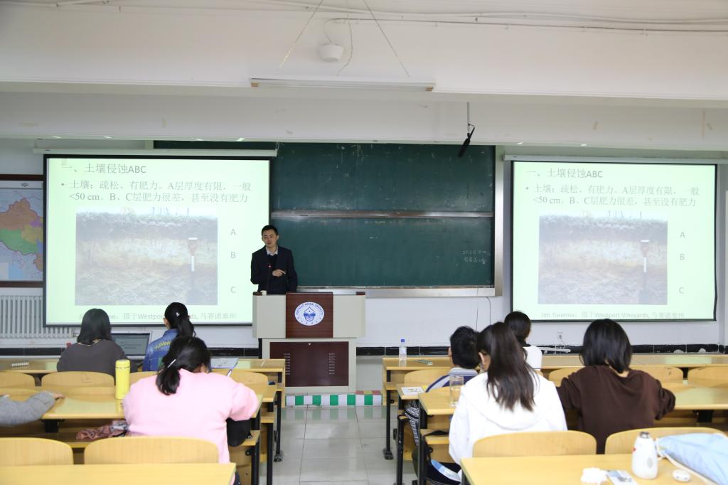 首先,张天宇老师以《流失的黑土地》为主题,从专业性的角度为同学们普及了土壤侵蚀中的土壤风蚀及水蚀监测的相关方法。接下来,张老师系统地为同学们介绍了东北黑土区现在的相关情况,并风趣地伴以实例叙述,拓宽了同学们的视野,也激发了同学们的学习兴趣,使同学们不但了解到东北风蚀、水蚀的严重性,而且也意识到黑土资源的宝贵性。然后,徐志伟老师以《土壤微生物的生物地理格局》为主题,极具条理性地从土壤微生物的相关概念、微生物的作用、土壤微生物的测定方法及土壤微生物的空间文化四个方面向同学们讲述相关知识,拓展了同学们的知识面,也使得同学们更加深刻地懂得了有关土壤微生物的相关知识。