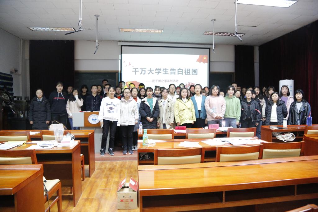 10月16日,由我院团委组织部开展的主题为“千万大学生告白祖国——团干部之家”系列活动于四楼报告厅成功举办。参与本次活动的嘉宾有团委书记沈雯老师、团委优秀部长代表及2017、2018、2019级全体团干部。
